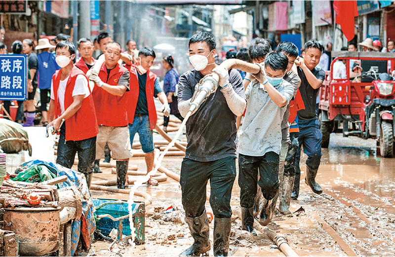 ??敢于擔(dān)當(dāng)作為是中國共產(chǎn)黨人一以貫之的優(yōu)秀品質(zhì)。圖為2025年6月30日,在貴州省從江縣丙梅街道俞家灣社區(qū),黨員志愿者在參與清淤工作。 人民圖片 羅京來/攝